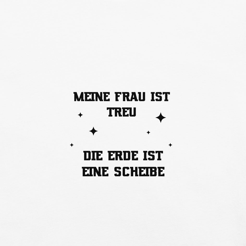 Der Spruch „Meine Frau ist treu, die Erde ist eine Scheibe“ verbindet trockenen Humor mit einem augenzwinkernden Vergleich und sorgt garantiert für Aufmerksamkeit und Gesprächsstoff.