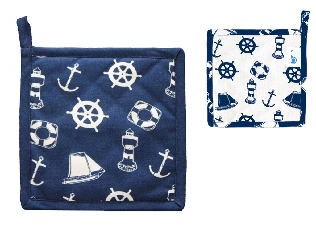 - 2er Set Topflappen im maritimen Design. Maße 20x 20 cm, 100% Baumwolle, 40° Maschinenwäsche. Gesteppt. Diese Angebot beinhaltet 2 Topflappen.
