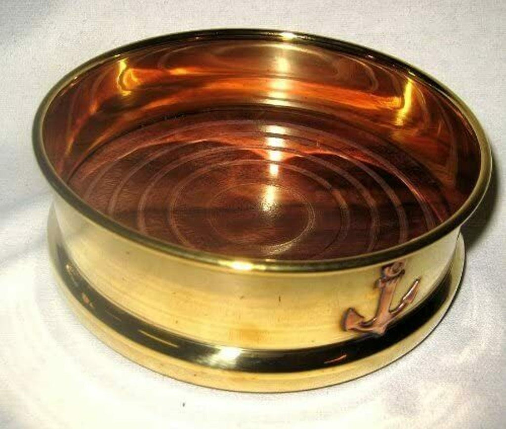 Origineller Flaschenpulli mit Mütze im maritimen Stil. 18x 6-9 cm aus Baumwolle+ maritimer Untersetzer aus Messing und Holz mit den Maßen 13x 4,5 cm.