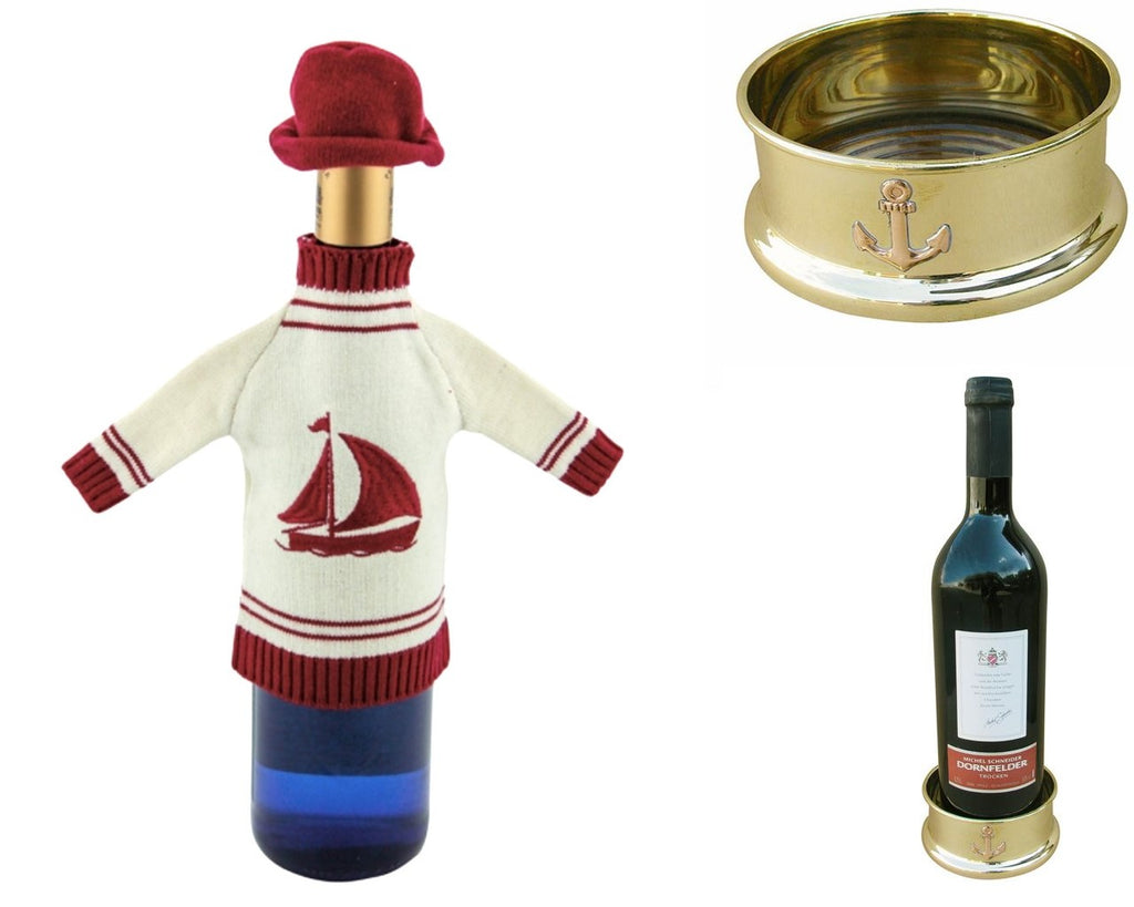 Flaschenpulli - rot/weiß mit Mütze+ Untersetzer Flaschen aus Messing/Holz-Segler
