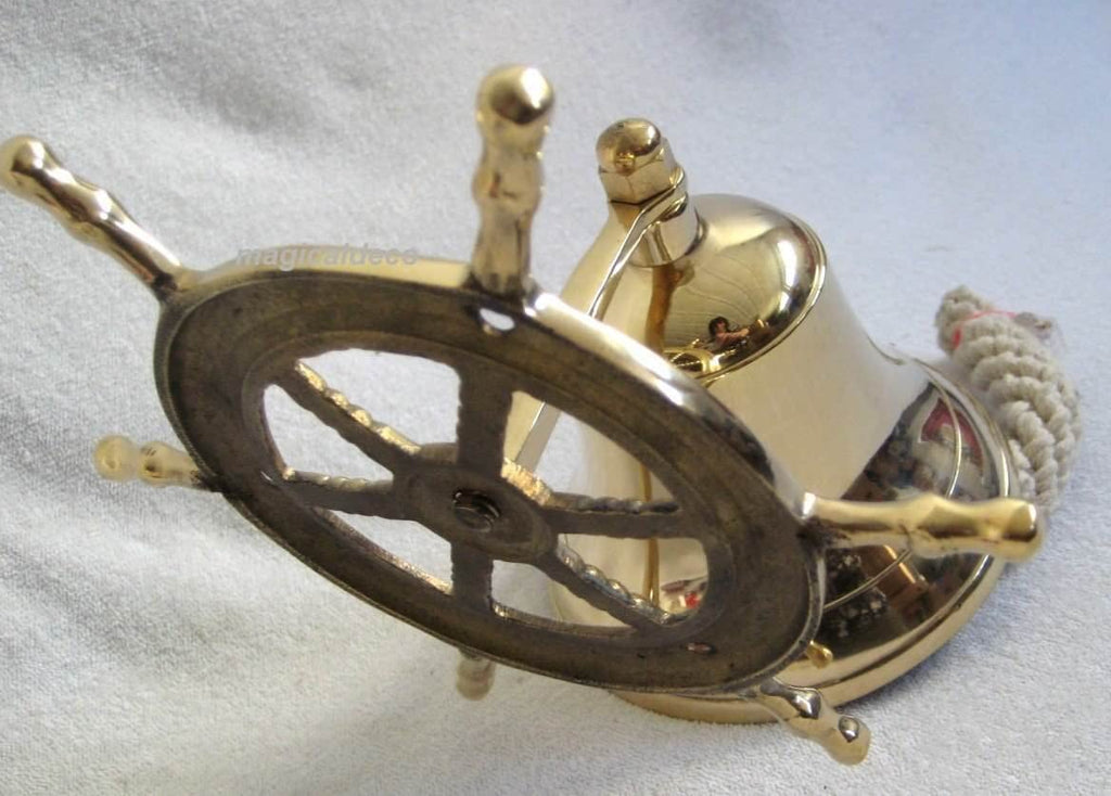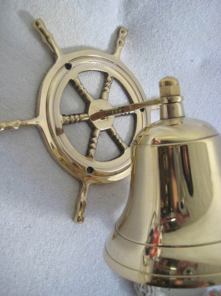 • Schöne Glocke aus Messing. Durchmesser der Glocke unten beträgt 7,5 cm, Höhe ca. 10 cm. Durchmesser Steuerrad ca. 10 cm. Bändsel ist in dunkelblau- siehe letztes Bild- nicht wie abgebildet in weiß.