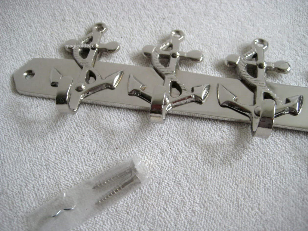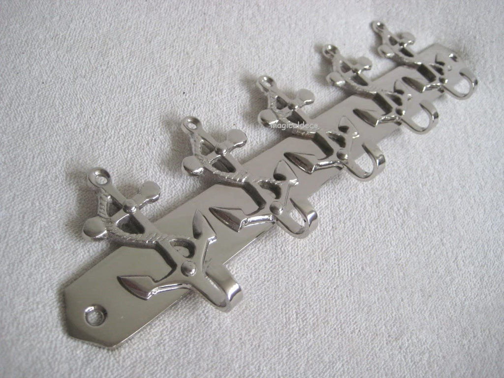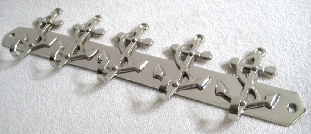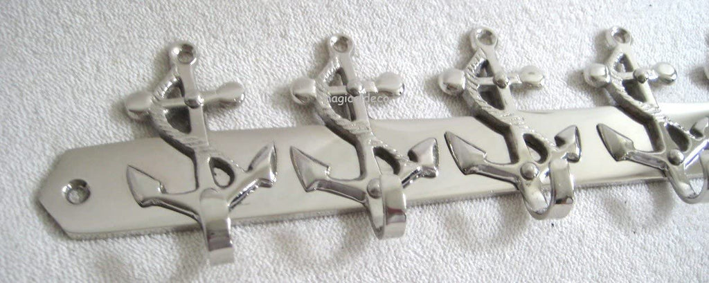 - Sehr schöne aus Messing, vernickelt (stellenweise etwas angedunkelt) gefertigte Hakenleiste im maritimen Stil. Mit 5 Haken versehen. Die passenden Messingschrauben für die Wandmontage sind im Lieferumfang enthalten. Länge 26 cm. Höhe 6,5 cm. Tiefe 2 cm. Gewicht 275 g. Eine maritime Dekoration der besonderen Art und ein toller Blickfang!