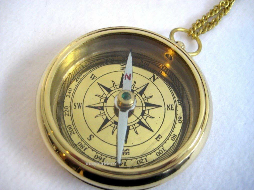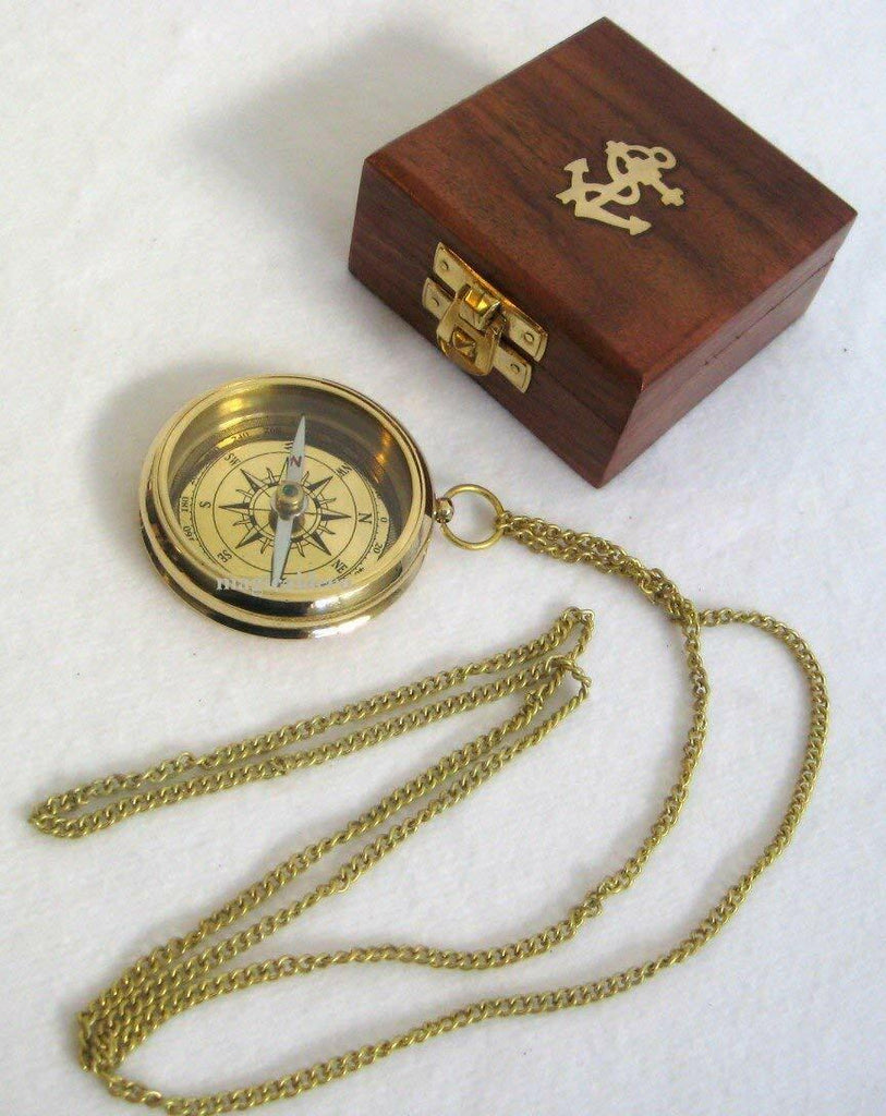 Schöner Kompass aus Messing mit einen Durchmesser von 6 cm. Mit langer Kette auch zum umhängen. Die edle Holzbox mit Messingintarsien ist innen mit blauem Samt ausgelegt und hat die Maße 9x 9x 5 cm.