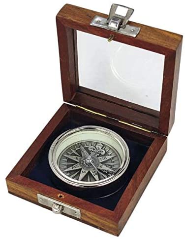 • Dekorativer Kompass, verchromt. Durchmesser 5,7 cm, Höhe 1,5 cm. Geliefert in einer Holzbox mit Glasdeckel. Natürlich funktionstüchtig.