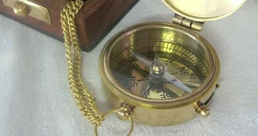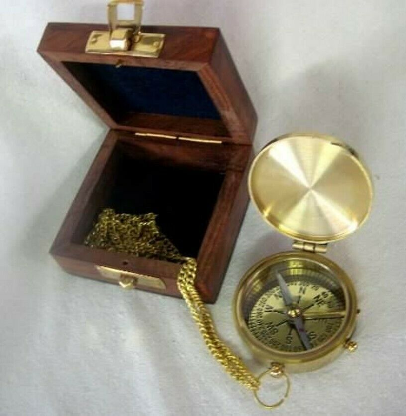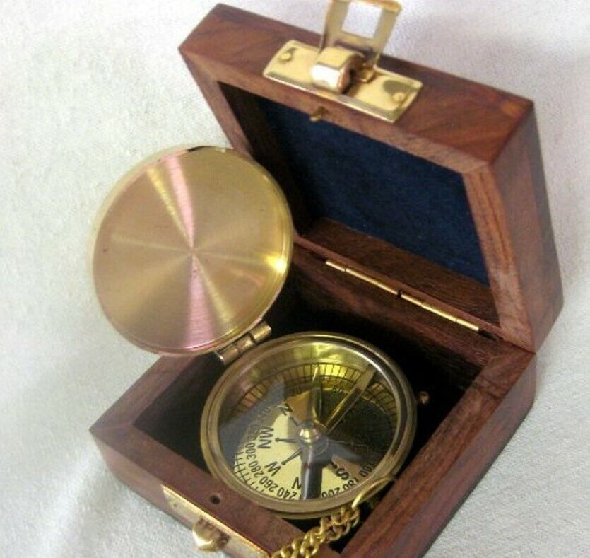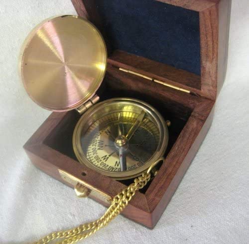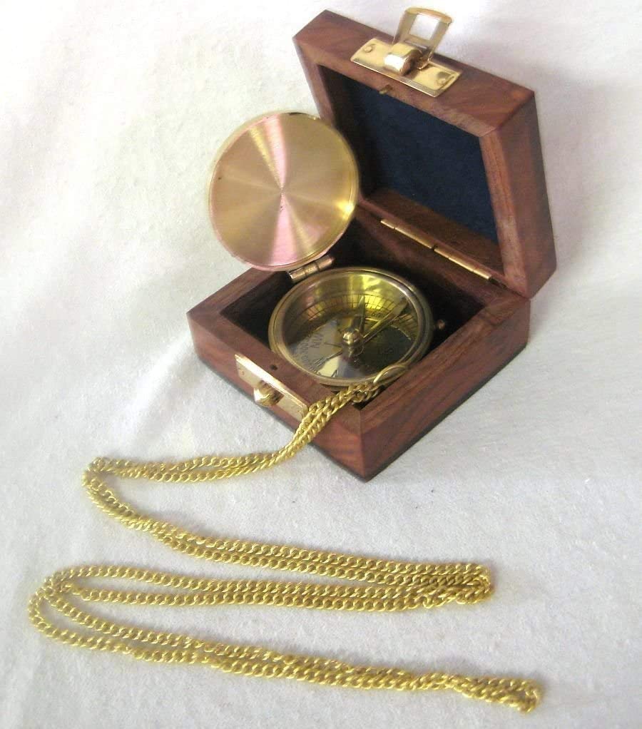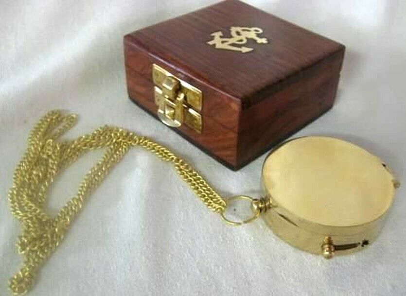- Taschenkompass aus Messing in einer dekorativen Holzbox. Durchmesser Kompass- 5 cm. Länge der Aufhängung einfach gemessen 50 cm. Maße der Holzbox 7x 7x 3,5 cm. Gewicht gesamt 210 g.