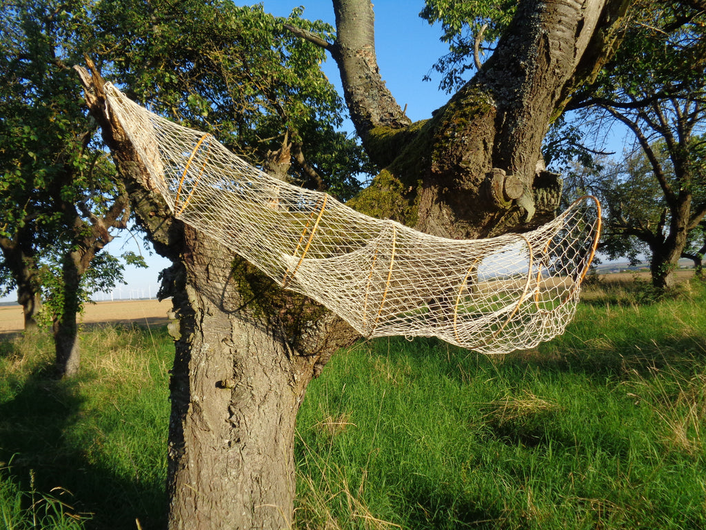 • Schöne, große Fischreuse mit 7 Bambusringen. Die Gesamtlänge beträgt 230 cm. Baumwollnetz in naturfarben. Das Bild mit den 5 Bambusringen ist ein Beispielfoto! Diese Reuse hat 7 Bambusringe.