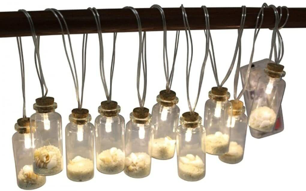 Lichterkette mit Glasflaschen welche mit Sand gefüllt sind. Gesamtlänge 170 cm. Maße der Fläschchen jeweils 6x 2,5 cm. Batterie nicht im Lieferumfang enthalten.