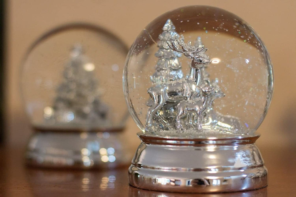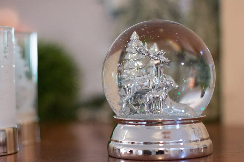 - Exclusive, große Schneekugel aus Glas mit Rentieren und Tannen. Metallteile versilbert und anlaufgeschützt. Maße H 12x 10 cm, stattliches Gewicht von 750 g.