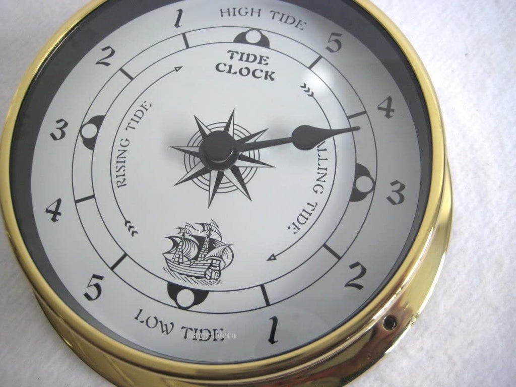 - Kleine, leichte Gezeitenuhr- (Quarzwerk) in Bullaugenform aus Messing. Durchmesser ca. 11,5/9 cm, Höhe ca. 3,4 cm. Batterie nicht im Lieferumfang enthalten.