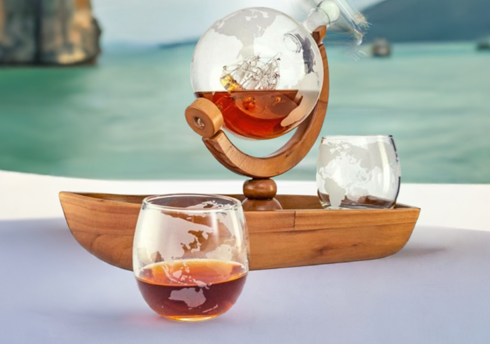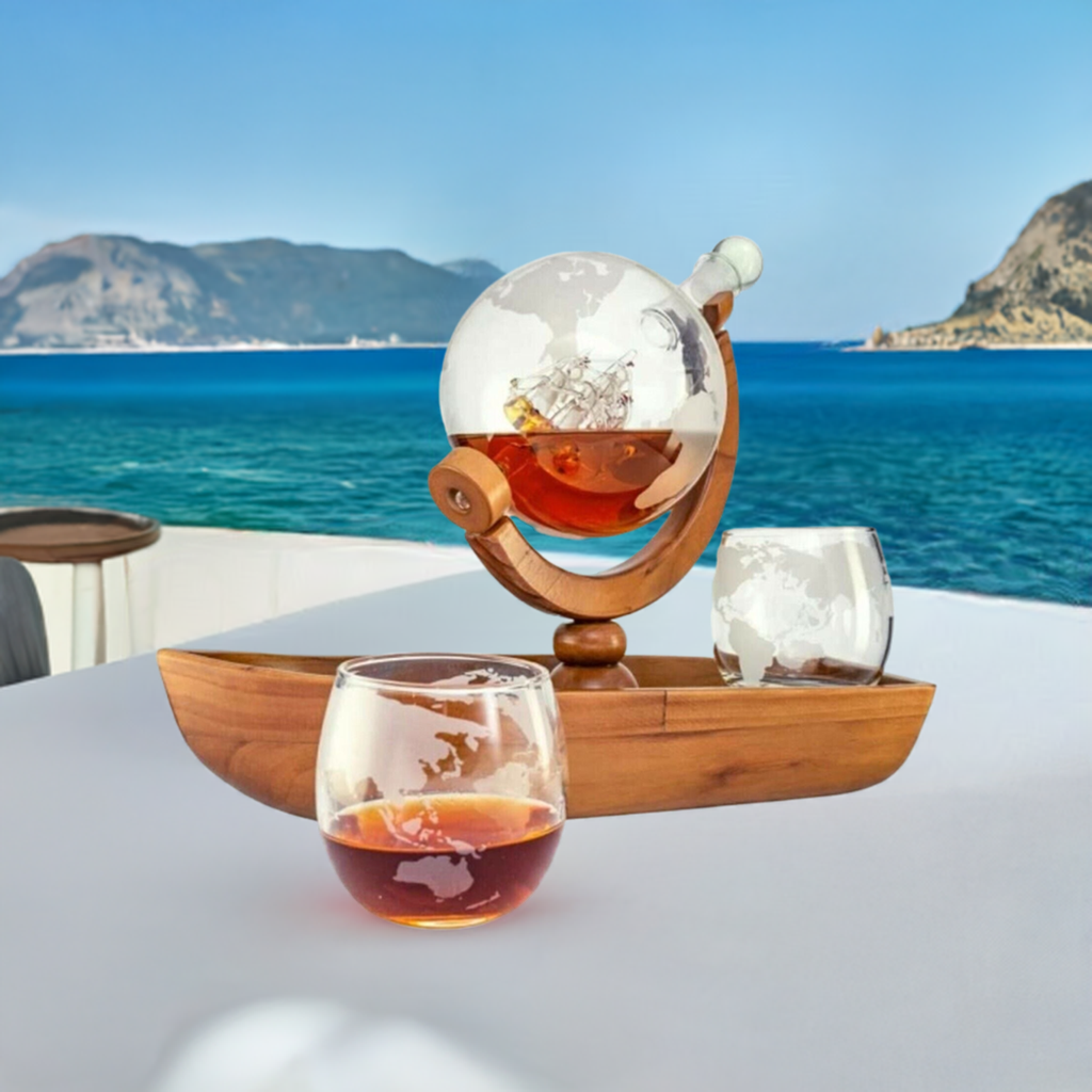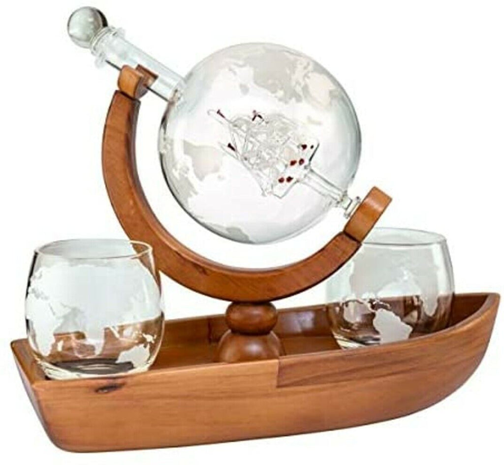 Flasche- Karaffe in Globusform- Weltkarte + 2 Gläser- Bootsständer aus Holz