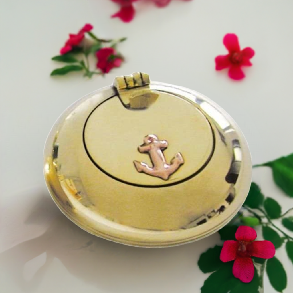 Cenicero plegable de bolsillo fabricado en latón y cobre, decorado con un ancla. El diámetro es de 5 cm. Ideal para viajes: manejable y práctico.