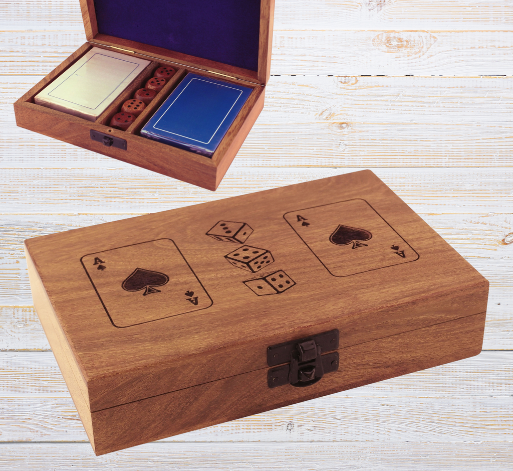 - Elegante y decorativo juego de cartas en caja de madera con tapa abatible y decorado con incrustaciones de latón. Dimensiones 11x 7,5x 3,5 cm. ¡Por supuesto que es nuevo y una gran idea para un regalo!
