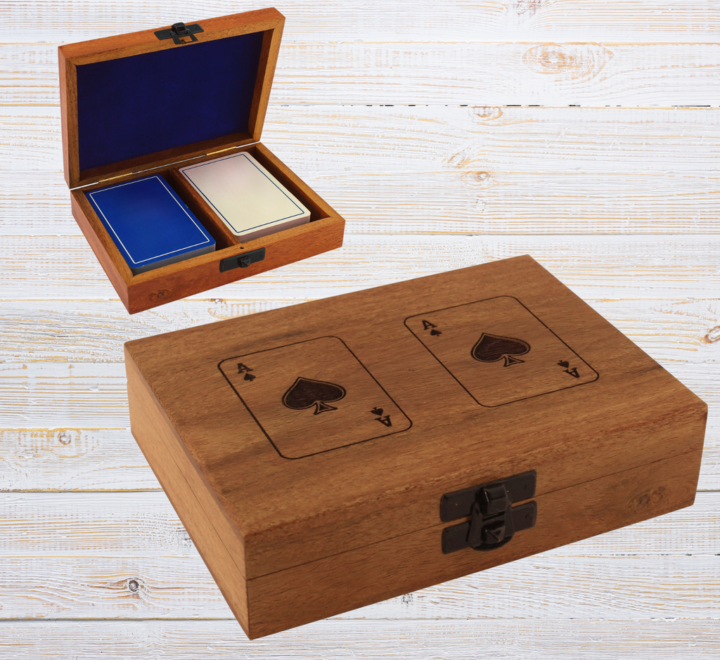 - Elegante y decorativo juego de cartas en caja de madera con tapa abatible y decorado con incrustaciones de latón. Dimensiones 11x 7,5x 3,5 cm. ¡Por supuesto que es nuevo y una gran idea para un regalo!