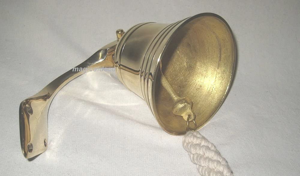 - Preciosa campana de barco de latón macizo. Largo total aprox. 40 cm incluida la cinta. Diámetro del fondo de campana 10 cm. Peso 600g.