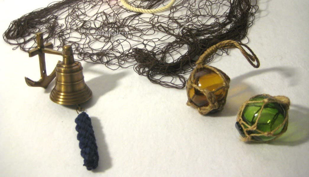 Juego de 6 marítimos - pequeñas bolas de pesca de 7,5 cm, campana de barco, red de pesca de 2x 1 m - aro salvavidas de 20 cm