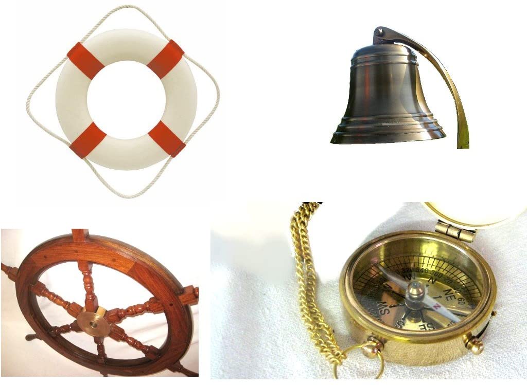 Juego de 4 - regalo/juego pirata - campana de barco, aro salvavidas de 20 cm, volante de 45 cm, campana de barco de 10 cm, brújula de bolsillo de latón
