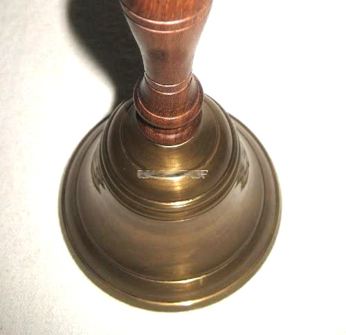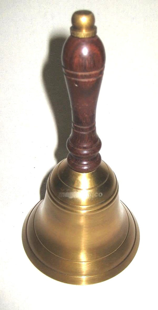 - Campana de mesa de latón bruñido, cepillado mate, resistente al deslustre, con mango de madera, de diseño estable y con un sonido fuerte. La altura total es de 16,5 cm, el diámetro de la campana en la parte inferior es de 9 cm.