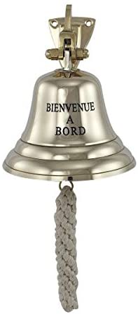 Preciosa campana de barco - con grabado BIENVENUE A a bordo - de latón con soporte y cinta