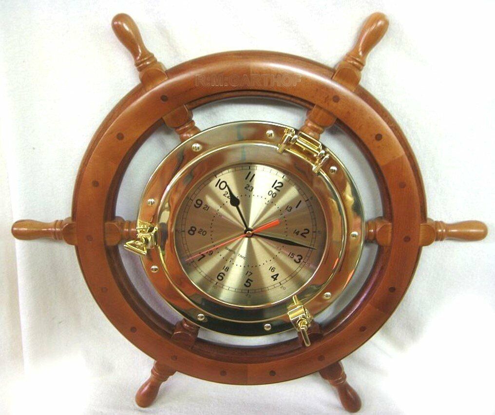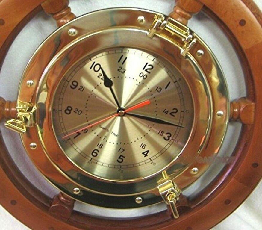 Volante grande y macizo con gran reloj de ojo de buey de 29 cm de latón/madera