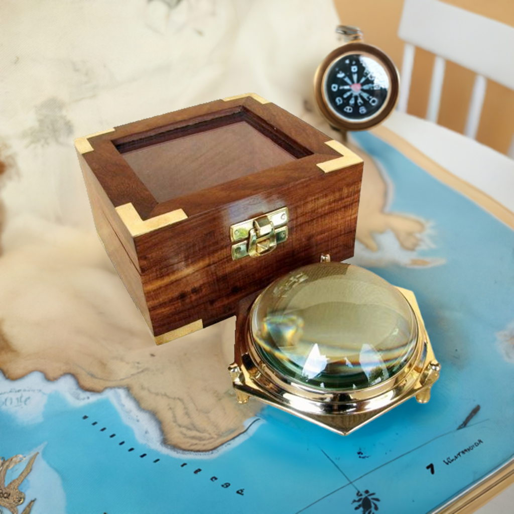 - Elegante lupa de cristal en caja decorativa de madera con tapa de cristal - dimensiones 12x 11,5x 7 cm. La lupa está hecha de latón y vidrio; el diámetro de la lupa es de 10 cm.