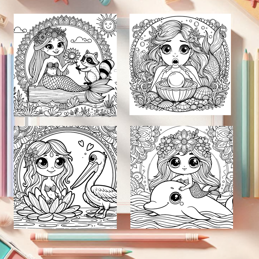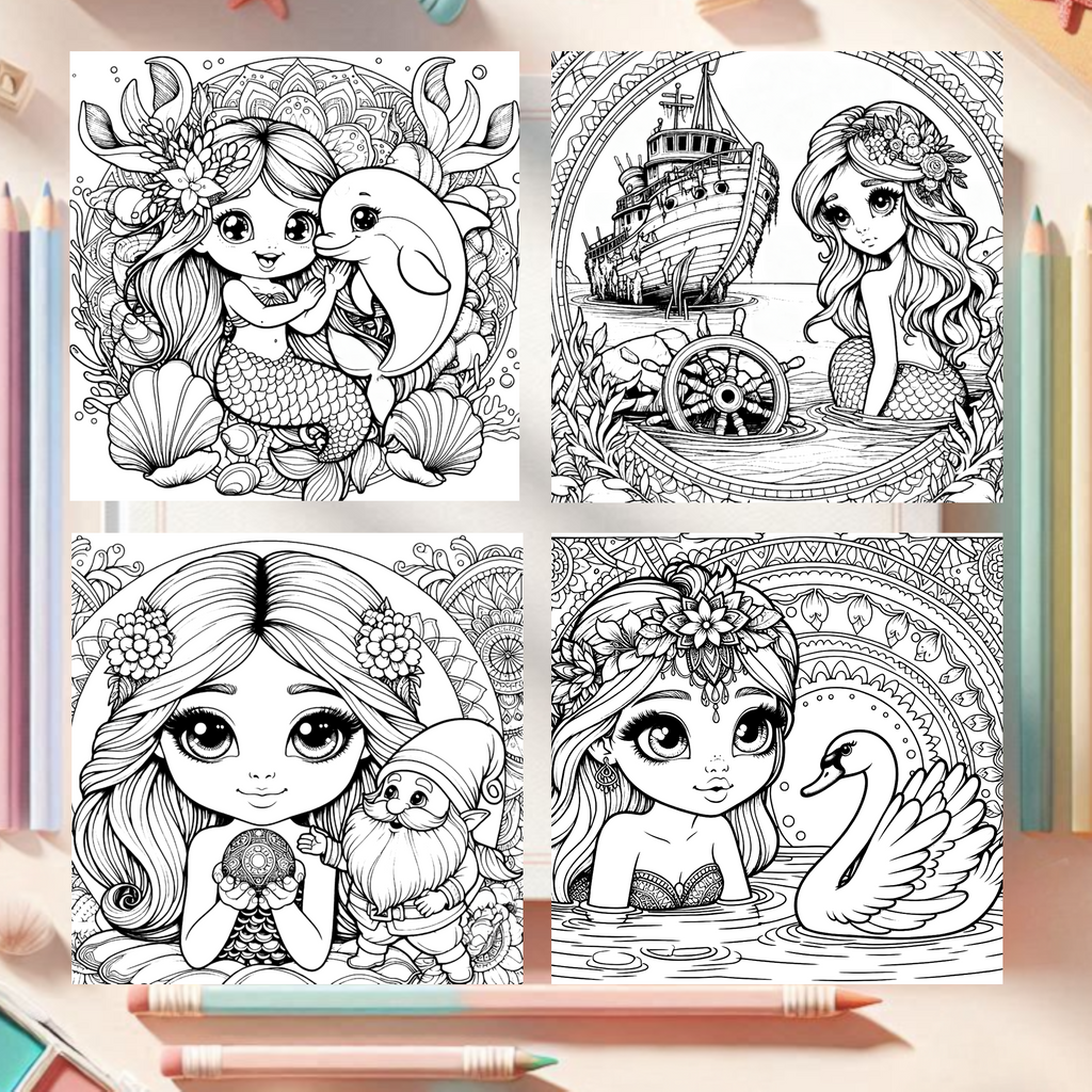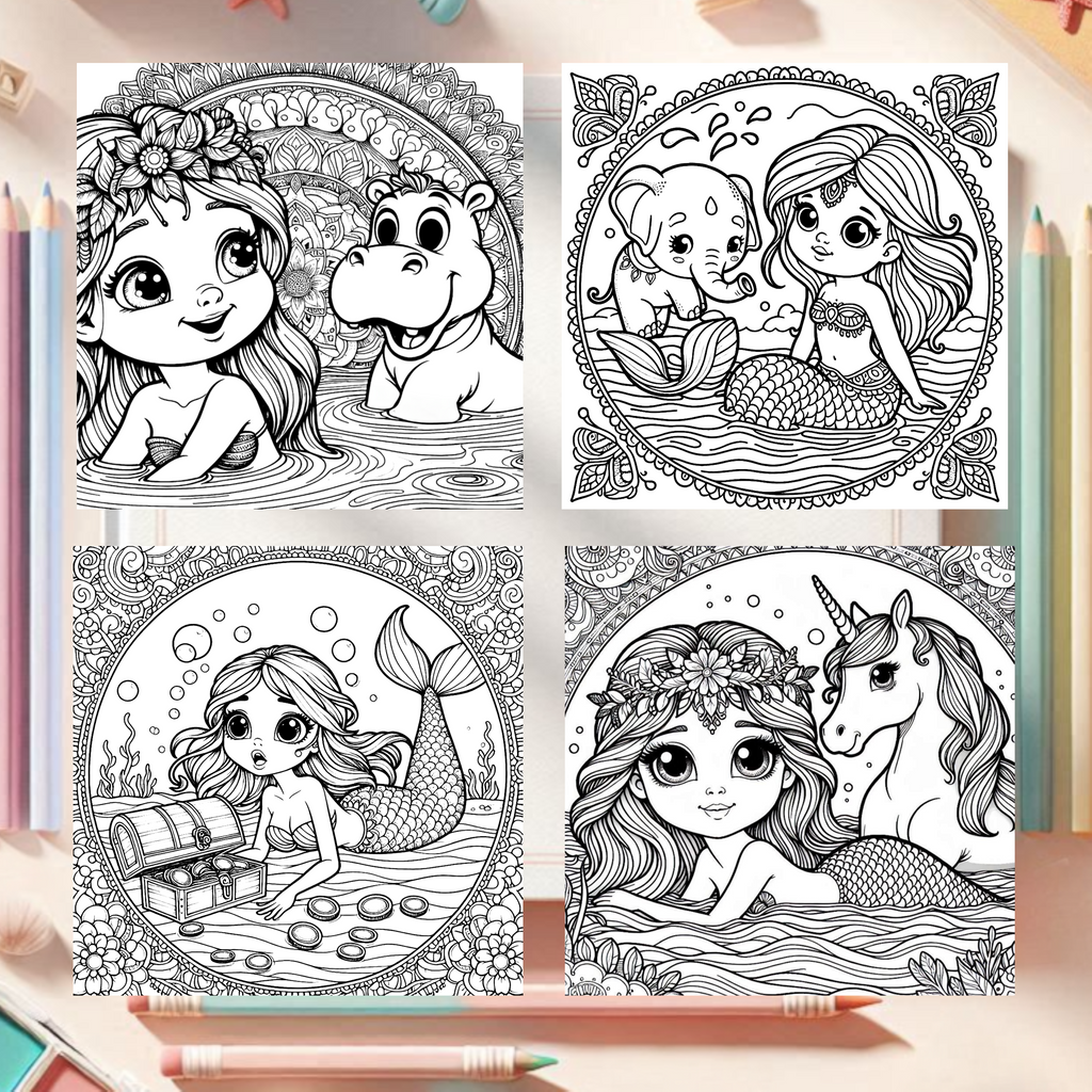 Im Reich der Meerjungfrauen, 40 Malbuchvorlagen im Mandalastil mit märchenhaften Meerjungfrau-Motiven für Kinder ab 7 Jahren. Die PDF-Datei wird per E-Mail versendet und bietet kreative Ausmalszenen im praktischen Quadratformat – ideal für konzentriertes, entspannendes Malen.