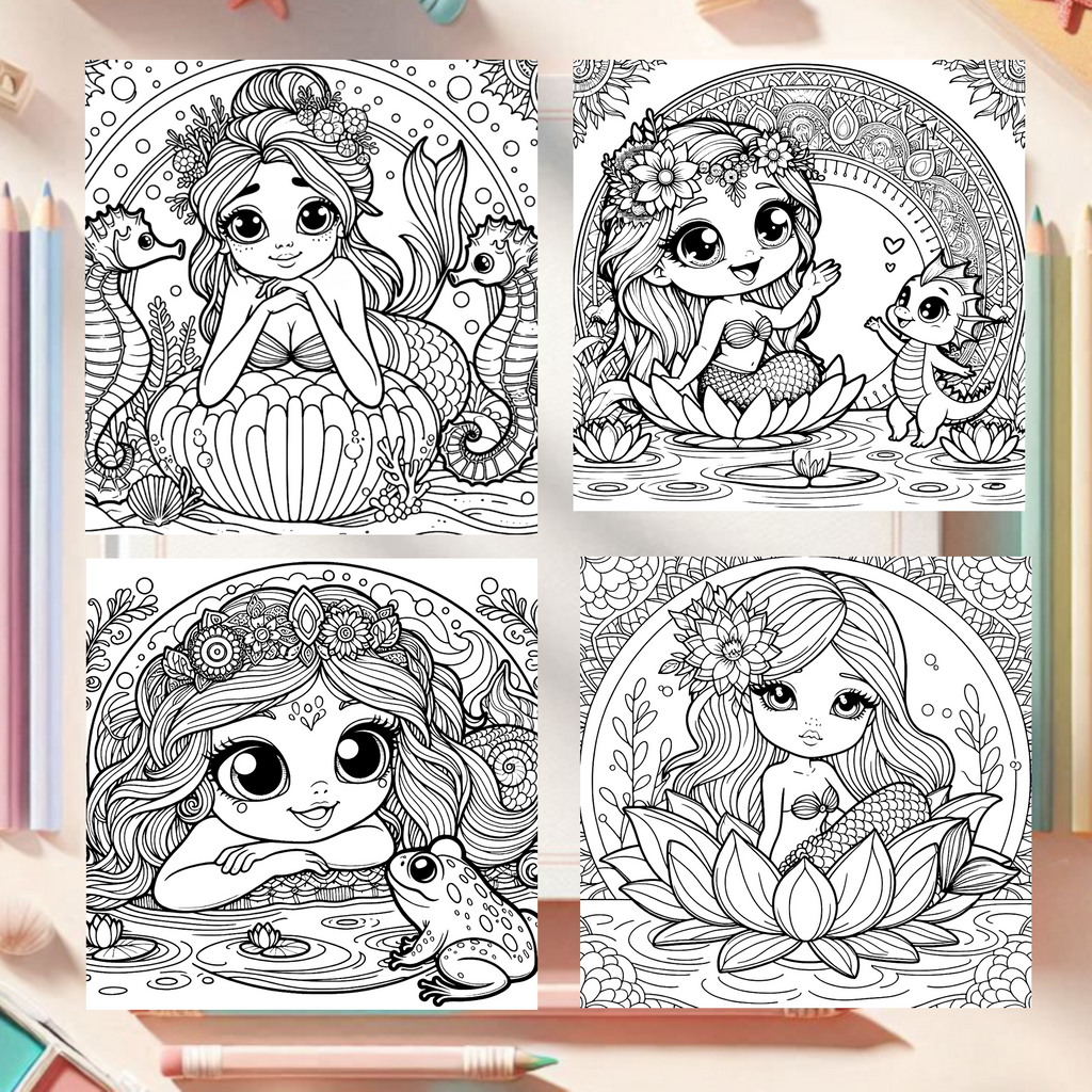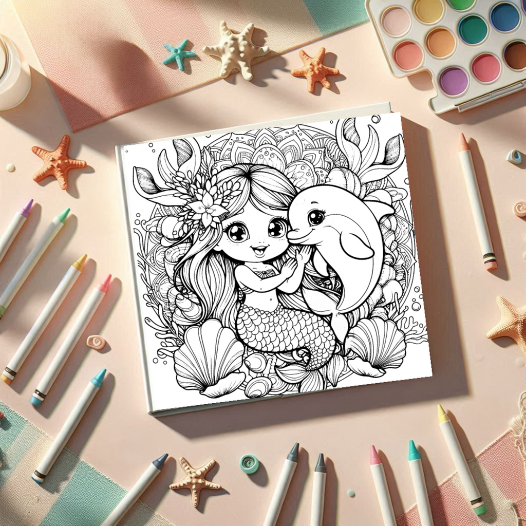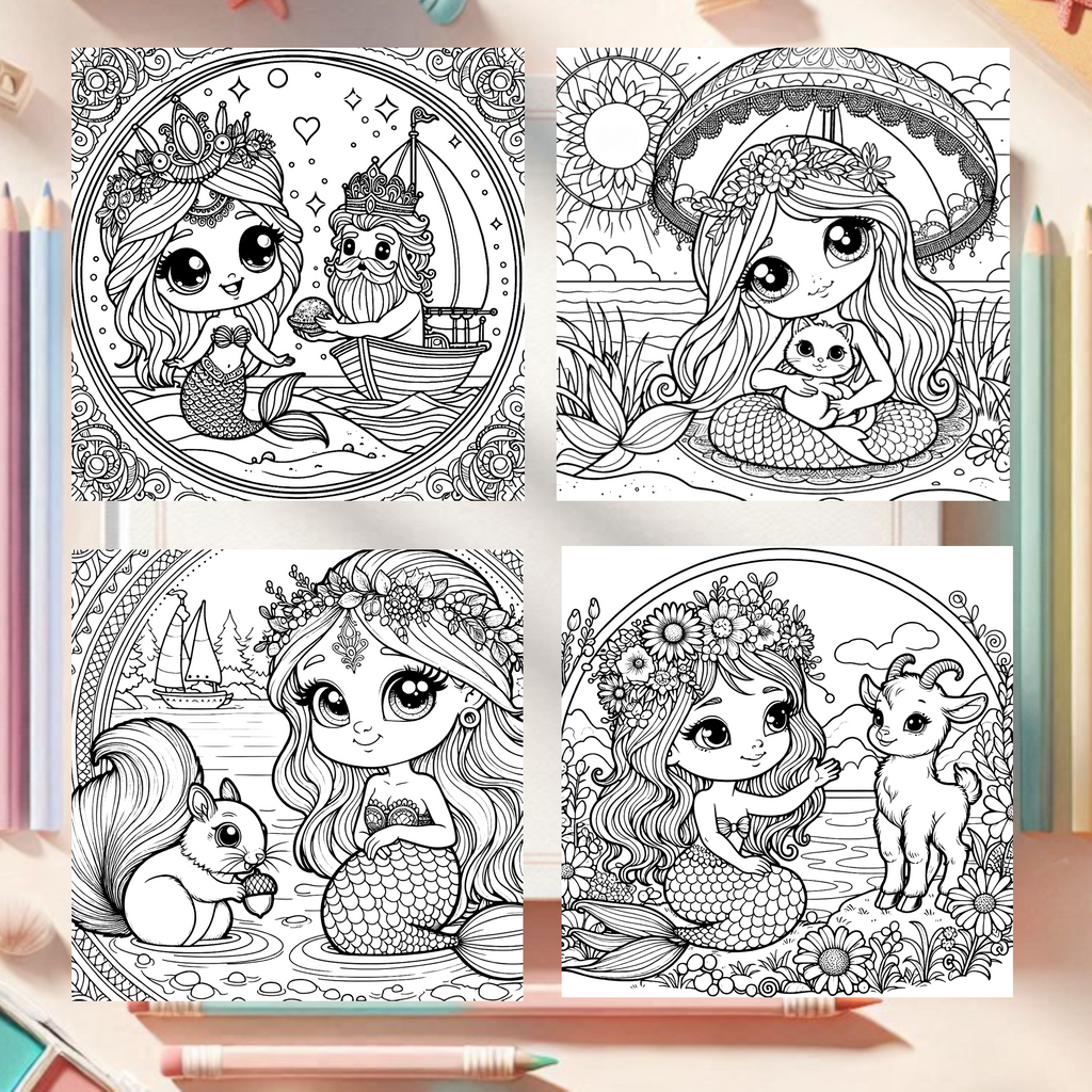 Im Reich der Meerjungfrauen, 40 Malbuchvorlagen im Mandalastil mit märchenhaften Meerjungfrau-Motiven für Kinder ab 7 Jahren. Die PDF-Datei wird per E-Mail versendet und bietet kreative Ausmalszenen im praktischen Quadratformat – ideal für konzentriertes, entspannendes Malen.