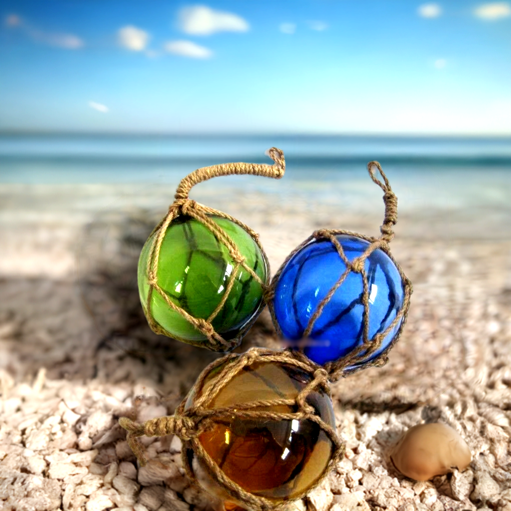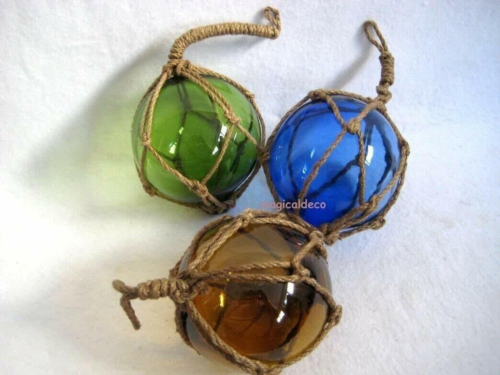 • 3 piezas de bolas de pesca de vidrio, tejidas en una red hecha de cordón de cáñamo.