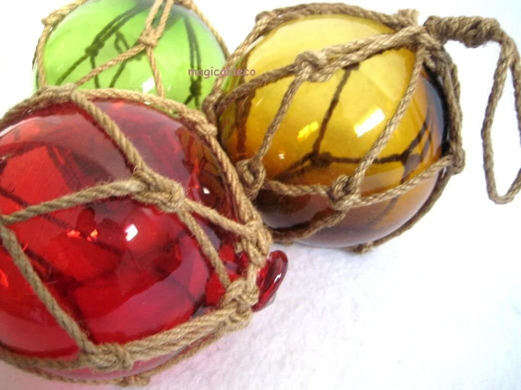- 3 piezas de bolas de pesca de vidrio, tejidas en una red hecha de cordón de cáñamo. Diámetro 7,5 cm cada uno.