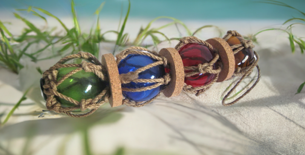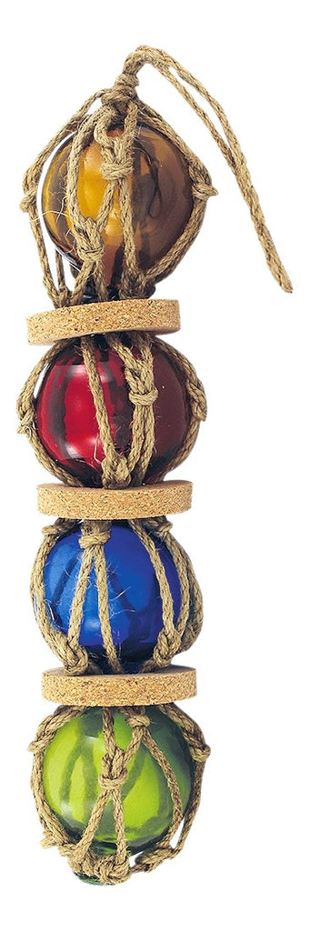 - 4 bolas de pesca hechas de vidrio, tejidas en una red hecha de cuerda de cáñamo. 5 cm de diámetro cada uno. Largo 25 cm con suspensión 36 cm. Un total de 4 bolas de pesca.