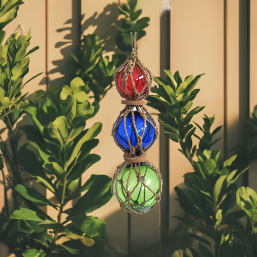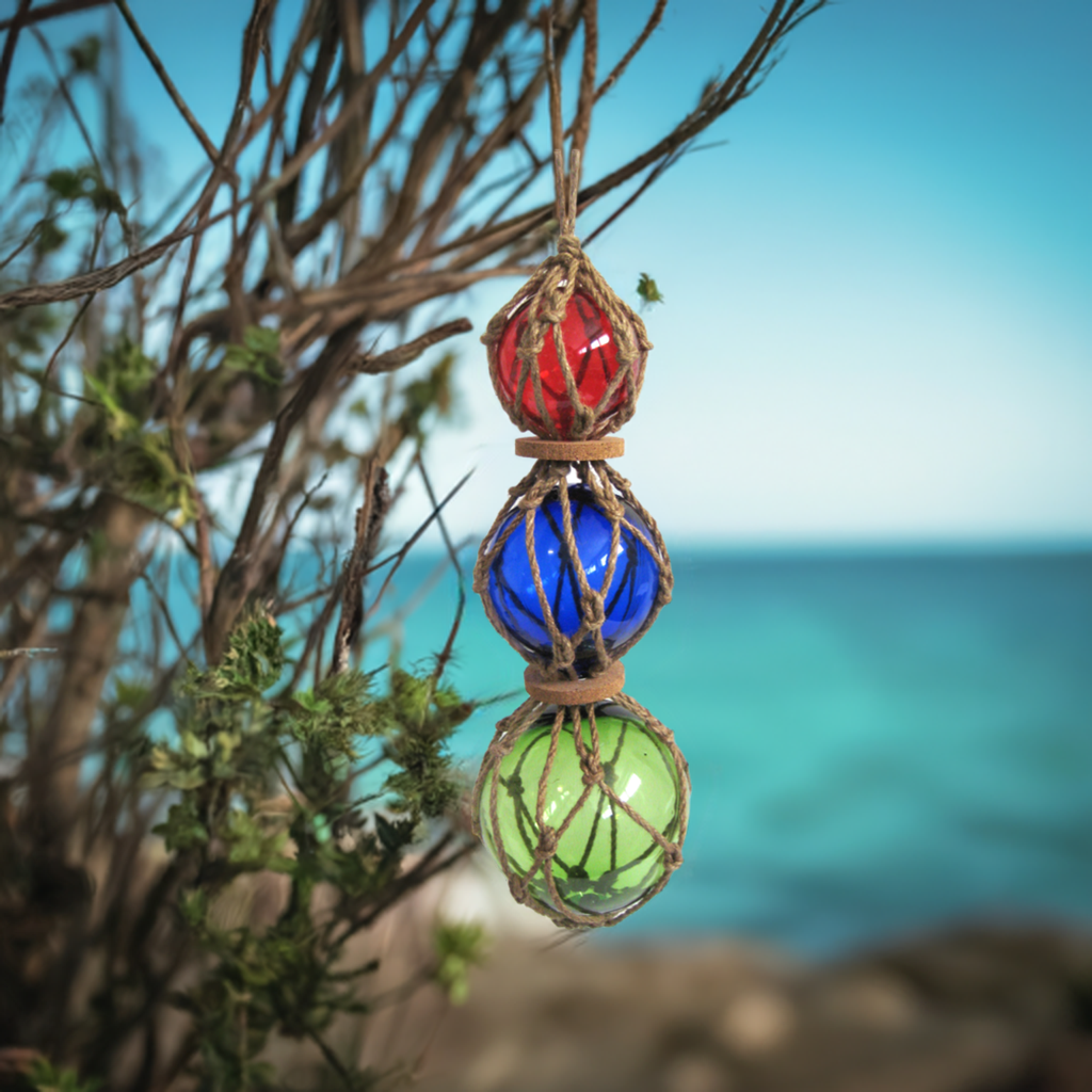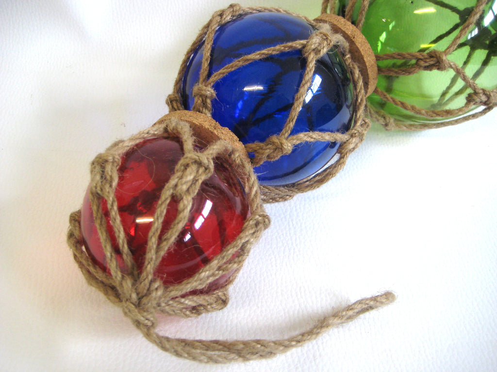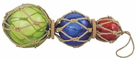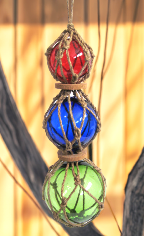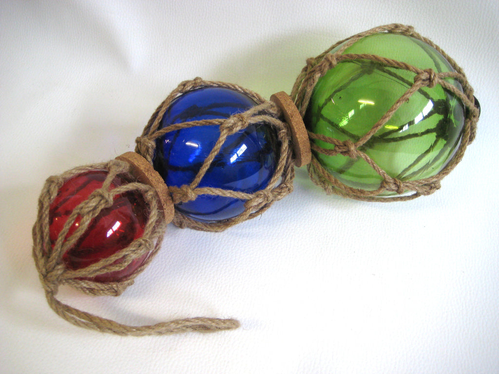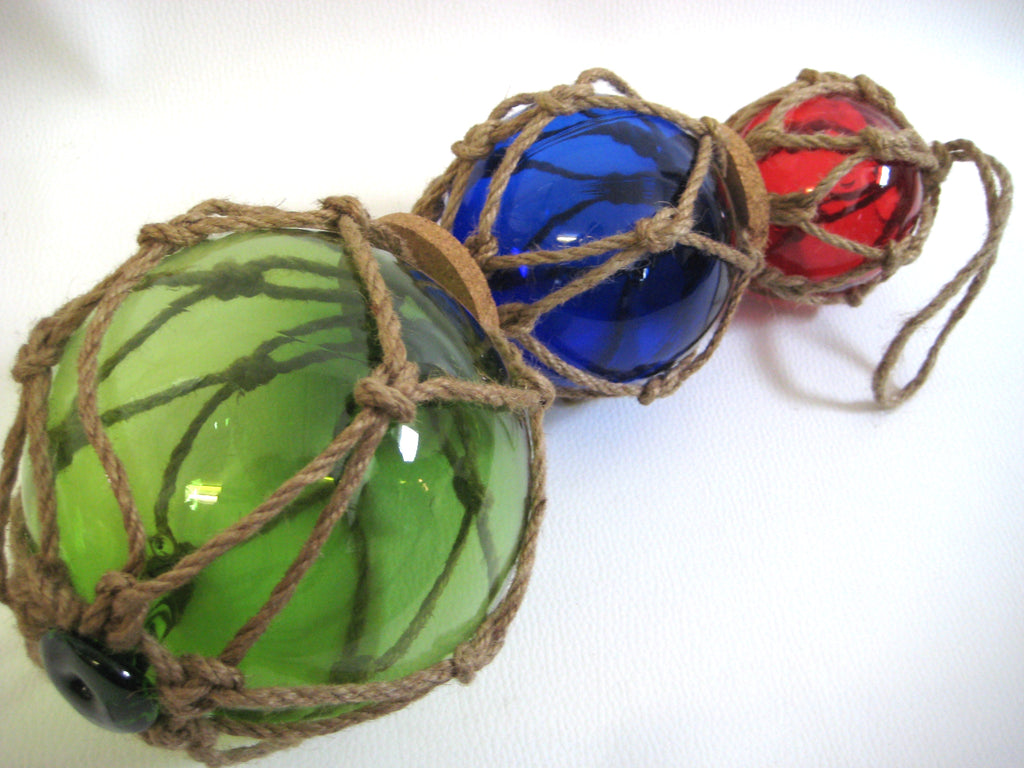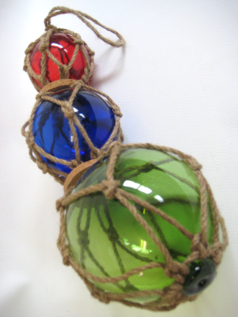 - 3 bolas de pesca hechas de vidrio, tejidas en una red hecha de cuerda de cáñamo. Diámetro 7,5, 10 y 12,5 cm. Largo 36 cm con suspensión 50 cm. Un total de 3 bolas de pesca.