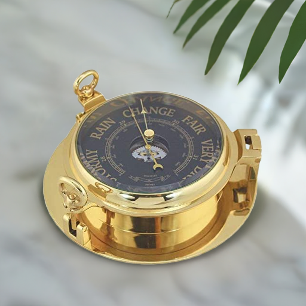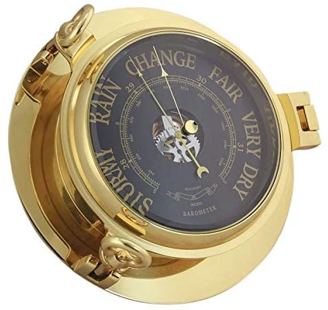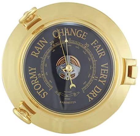- Barómetro de estilo marítimo fabricado en latón, macizo y pulido, en forma de ojo de buey con cierres y bisagra. El diámetro total es de 22,5 cm, barómetro de 14 cm, altura de 8 cm. ¡Un regalo ideal y un accesorio marítimo muy decorativo y especial!