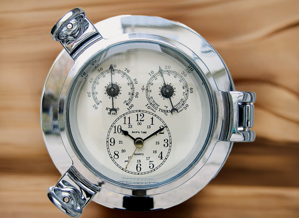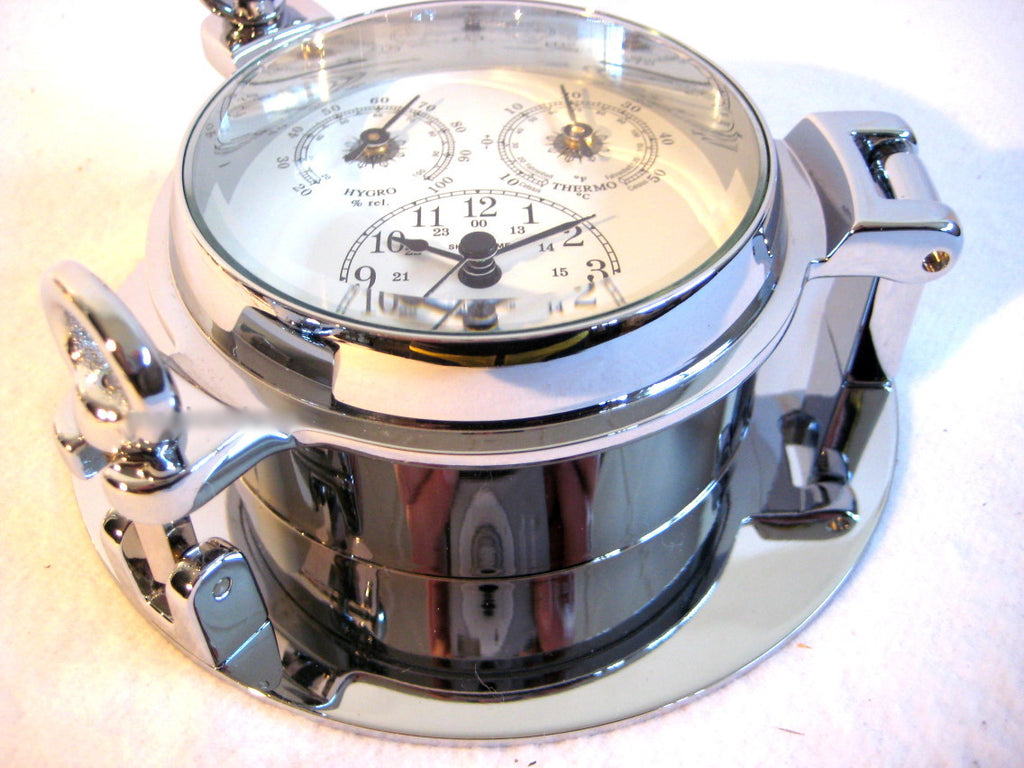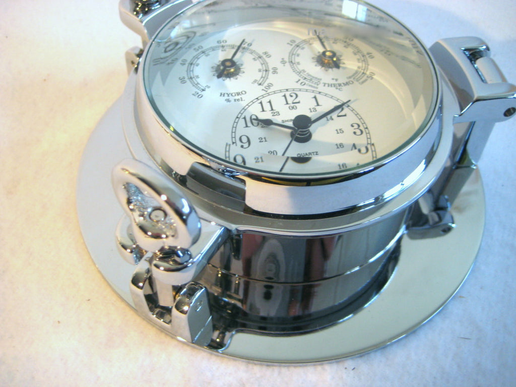 Uhr, Thermo- & Hygrometer-Bullauge, massiv Messing, verchromt