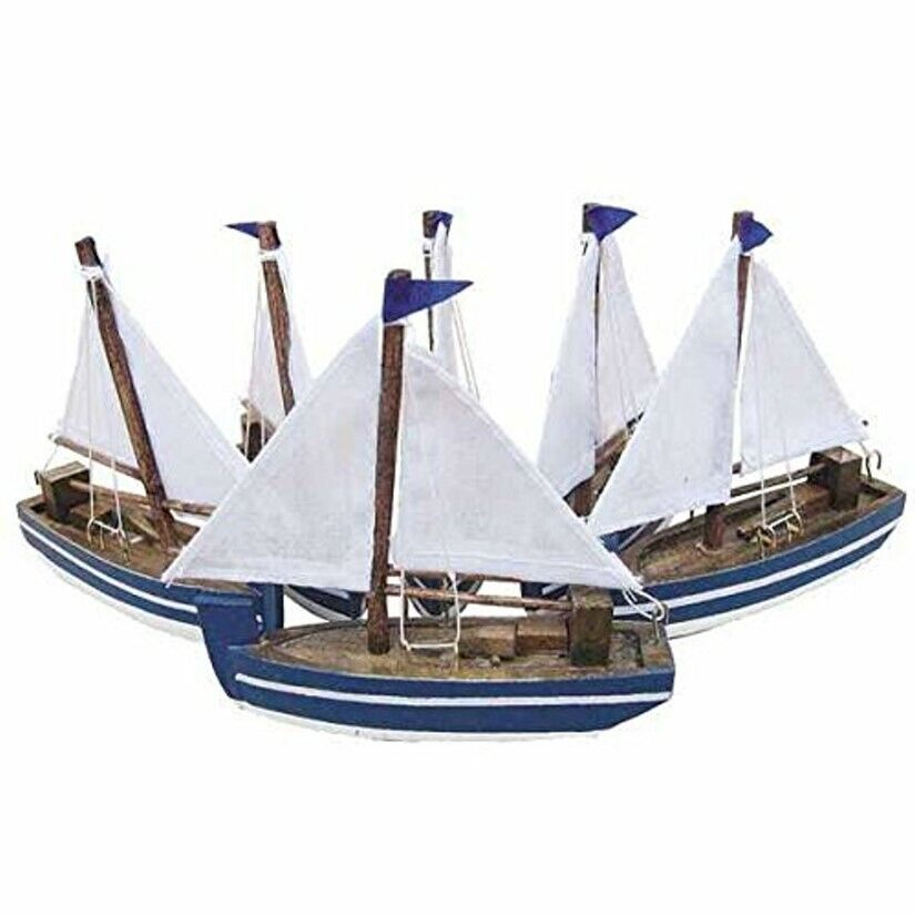 Set de 6 maquetas de barco/marinero/velero de madera con velas de tela