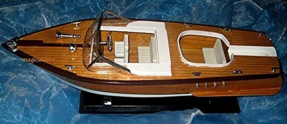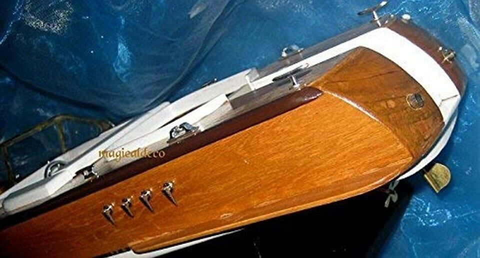 Precioso modelo de barco deportivo italiano con dimensiones: eslora 50 cm. Altura aprox.15 cm. El barco está hecho de madera y está firmemente montado sobre un soporte de madera maciza. Provista de cariñosos detalles. Imprescindible para todo aficionado a las embarcaciones a motor o un noble regalo para los amantes del mar. Muy buena réplica y fiel al original.