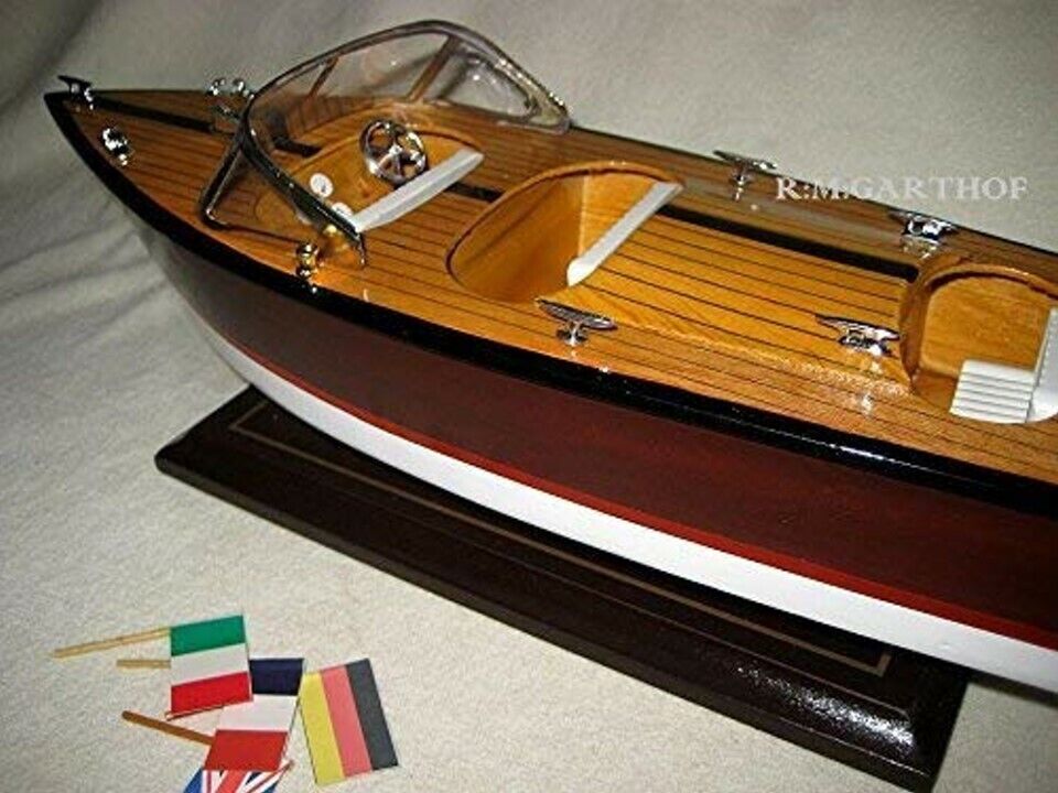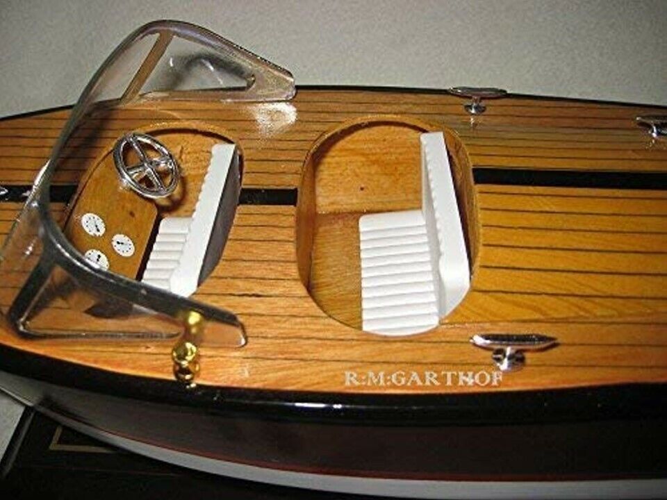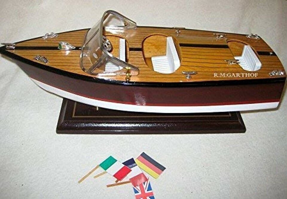 Bienvenido Descripción del Artículo Precioso modelo de barco deportivo italiano con dimensiones: eslora 35 cm. altura aprox. 13,5 cm. El barco está hecho de madera y firmemente montado sobre un soporte de madera maciza. Provista de preciosos detalles. Imprescindible para todo aficionado a las embarcaciones a motor o un noble regalo para los amantes del mar. Muy buena réplica y fiel al original. Envío dentro de Alemania: el envío es siempre solo 1X, sin importar cuántos artículos compre. Pero definitivamente espere mi información de pago después de las compras para poder corregir el envío, muchas gracias. ¡Cantidades mayores bajo pedido!