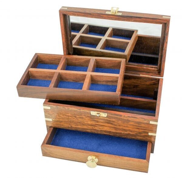 Joyero con espejo en la tapa. Bisagras e incrustaciones de latón en la tapa.