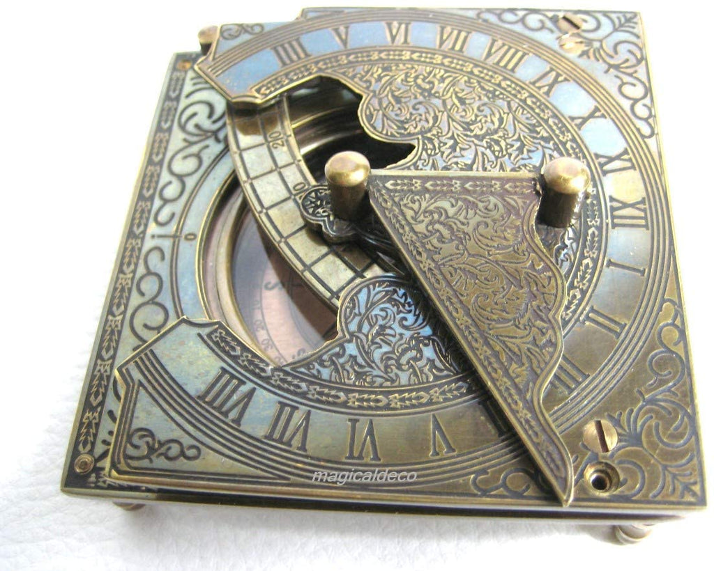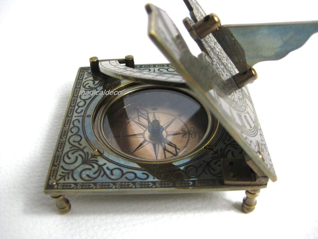 - Brújula de reloj de sol en caja de madera. La brújula de latón con diseño antiguo tiene un diámetro de 6x8 cm y una altura desplegada de 9,5 cm. . Por supuesto nuevo y funcional.