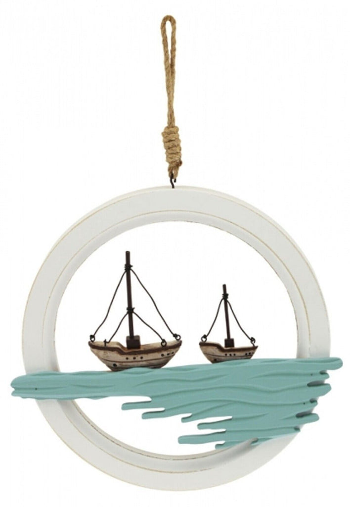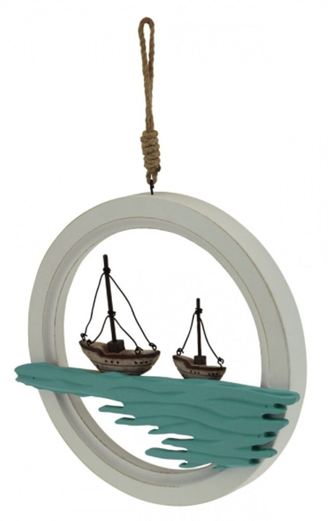 Decoración de pared marítima realizada en madera, pintada en estilo shabby. Dimensiones 42x 4,5 cm, diámetro 27,5 cm.